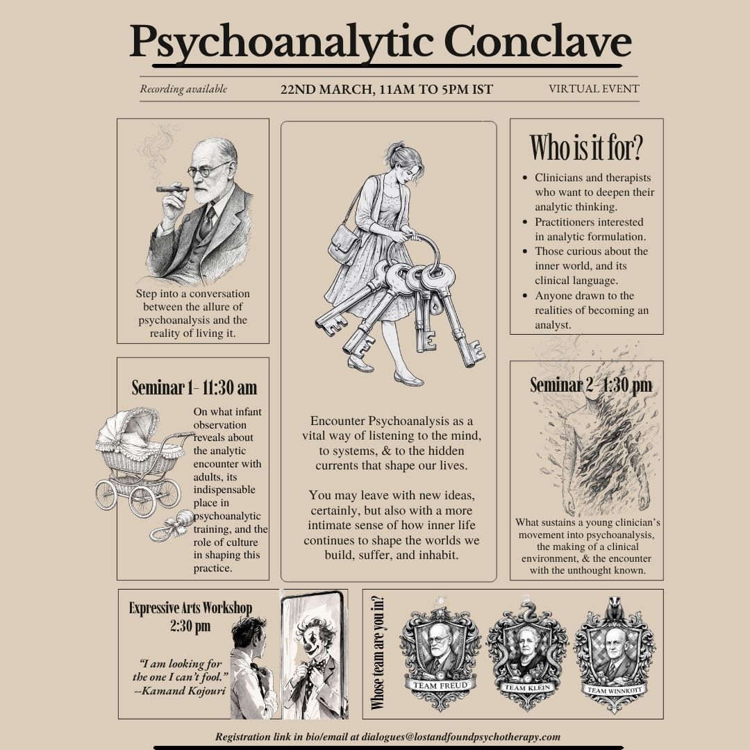 First Psychoanalytic Conclave The Psychoanalytic Conclave is Lost & Found's annual gathering invite psychoanalytic enthusiasts to play with and know our object, our psychoanalysis, a little better. A full day event, immersed in engagement with the thought with pockets of play and community building, this event is closest to what a psychoanalysis fare could look like!What This Workshop Will Explore